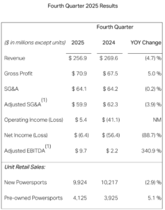 RIDENOW REPORTS Q4 RESULTS The numbers are in and RideNow Powersports reports Powersports Revenue totaled $256.1 million. Same store sales revenue was up 6.3%, driven by a 7.7% increase in unit sales… the result was Powersports Gross Profit of $70.7 million, up 10.1% in a down market. The positive Q4 performance helped offset some of the softer quarters in 2025. Subscribe To #Dealernews To See The Full Story: https://dealernews.com/Home/post/ridenow-reports-q4-results/