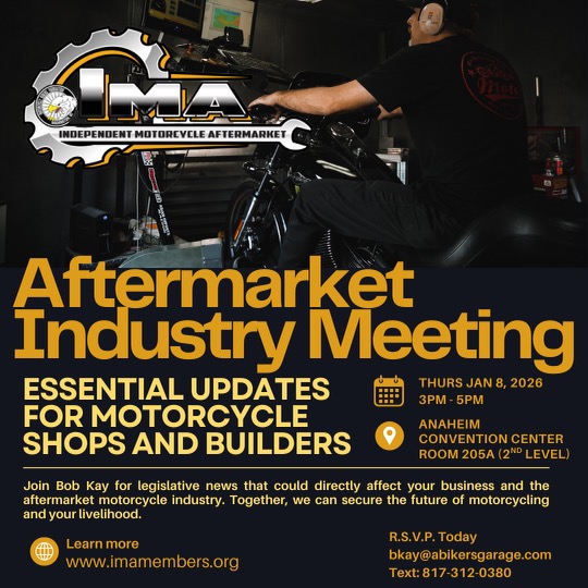Kay is hosting an Aftermarket Industry Meeting Thursday, January 8th from 3-5, Room 205A, Second Level Anaheim Convention Center. “The independent aftermarket industry is essential to the future of motorcycling,” he notes. “Every Independent Dealer should join IMA today.”