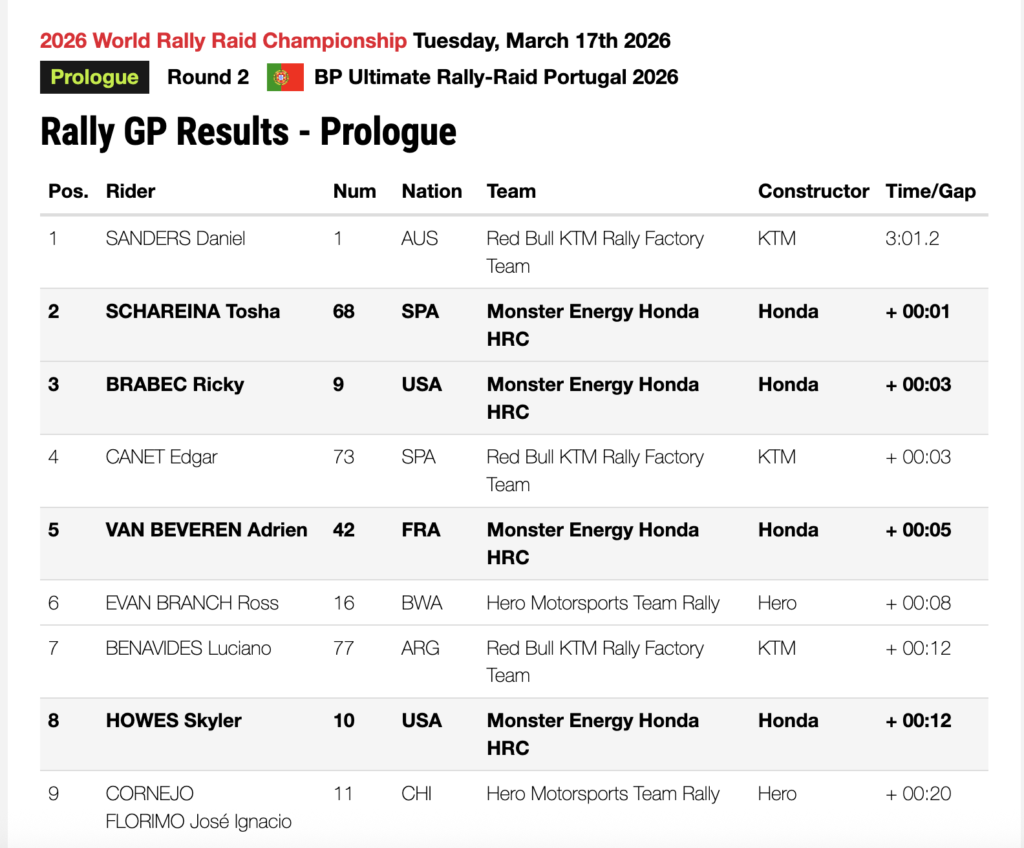 You can’t win the rally in the Prologue, but you can lose everything before the race even starts… However, Aussie Daniel Sanders must have missed the memo! “Chuckie” blazed through the sandy section in just 3:01. Perennial Prologue threat and 2024 Rally-Raid Portugal winner Tosha Shareina kept Sanders honest, just one second off the pace while his HRC Monster Energy teammate and Top American kept pace. Ricky Brabec, returning to his Honda CRF450 RALLY for the first time since the Dakar Rally in January, chased Tosha through the slippery conditions to finish just two seconds behind his teammate.