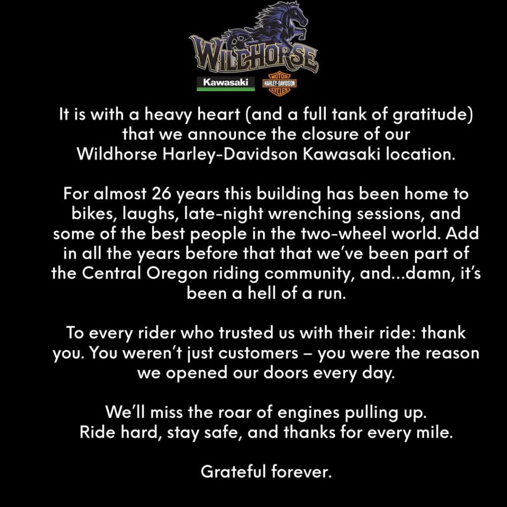 After 26 years of superior community building and a loyal customer base in the Bend, Oregon, area, Angy and John Stewart have decided to ride off into the sunset. “It is with a heavy heart (and a full tank of gratitude) that we announce the closure of our Wildhorse Harley-Davidson Kawasaki location,” says the post on Facebook.