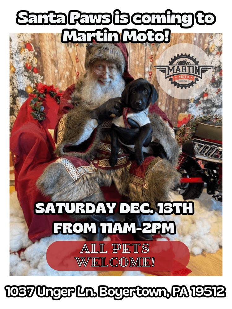For the past 3 decades Martin Moto has evolved from a humble garage in Pottstown, PA, to a spacious 24,000+ sq./ft. facility in Boyertown. During that time the Honda/Kawasaki/Triumph/Yamaha dealership has become renowned for their Modern Classics Ride-In bike show, and community functions like the visit from “Santa Paws” on Saturday.