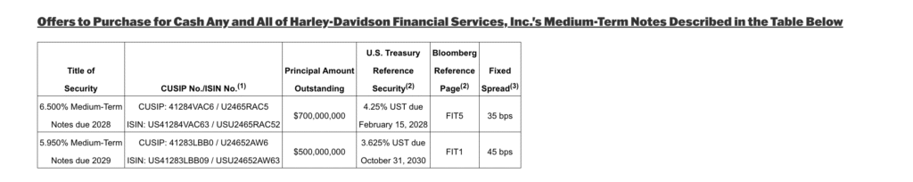 Led by J.P. Morgan Securities LLC, TD Securities (USA) LLC and Wells Fargo Securities, LLC — with Barclays Capital Inc. and U.S. Bancorp Investments, Inc. as co-dealer managers — Harley-Davidson Financial Services, Inc. announced the commencement of tender offers to purchase for cash any and all of the Medium-Term Notes issued by The Motor Company. These tender offers (the “Offers”) are being made pursuant to the Offer to Purchase, dated November 17, 2025.