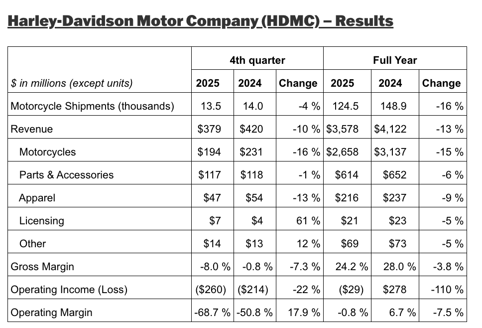 “As we close out a challenging year for The Motor Company, we are taking deliberate actions to stabilize the business, restore dealer confidence, and align wholesale activity with retail demand,” stated Artie Starrs, President and CEO, Harley-Davidson. “While near-term results reflect these actions, the progress we are seeing reinforces our confidence in the reset underway and our ability to rebuild Harley-Davidson’s long-term earnings and cash-flow power,” Starrs added. “With an iconic brand, a deeply loyal rider community, and a dealer network unlike any other, we believe Harley-Davidson is well positioned as we chart a clear path forward.”