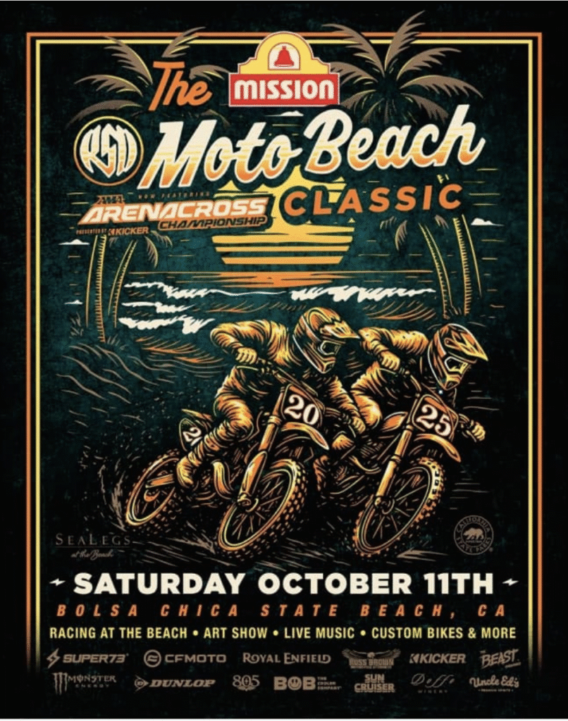 “The 2025 Moto Beach Classic is back in Bolsa Chica State Beach in the heart of two-wheeled moto culture,” says racer-turned impresario Roland Sands. “Whether it’s flat track racing, e-bikes, insane motorcycle stunt shows, or AMA Arenacross, the MBC has something for everyone as the event is built with the family in mind. If you’re into music, custom bikes, art, or amazing vendors paired with food and drinks on the beach, this event consistently delivers the best on two wheels.” The Moto Beach Classic is an event that could only be put on by the folks at Roland Sands Design in partnership with California State Beaches.