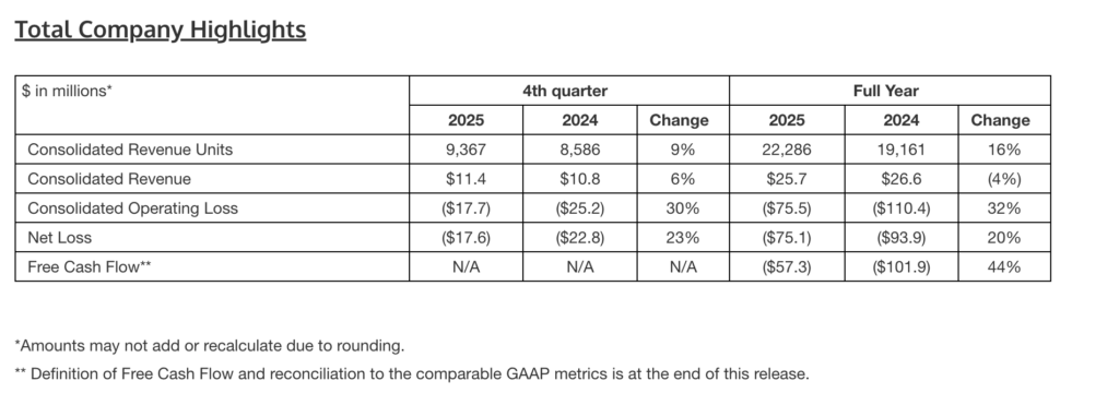 Take that “consolidated units” statement with a grain of salt: LiveWire’s full year unit sales in 2025 were 653 units, up 7% over 612 in units in 2024, the balance is STACYC unit sales. The Company’s consolidated net loss was $75.1 million for the year ended 2025 as compared to $93.9 million in prior year driven by the segment results noted below, offset by a decrease of $11.1 million of non-operating income related to the change in fair value of the outstanding warrants as of December 31, 2025 and a decrease of $4.5 million in interest income as compared to prior year.