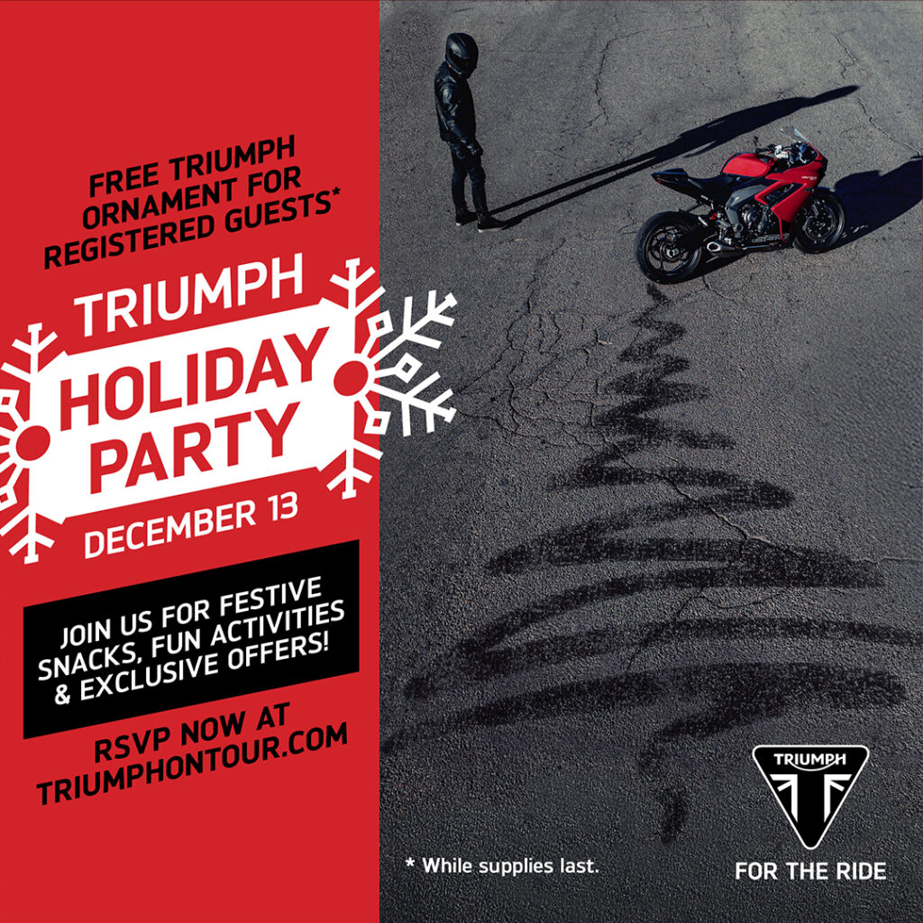 Nothing like getting into the holiday spirit at a dealership, so Triumph Motorcycles is inviting riders to come to their dealers and join the fun on a nationwide day of good cheer with great motorcycles! The Triumph National Dealership Holiday Parties, hosted at participating dealerships across the United States and Canada, takes place on Saturday, December 13th, 2025. The plan is to give riders and Triumph enthusiasts the perfect excuse to visit their local Triumph dealership while they’re wrapping up their shopping.