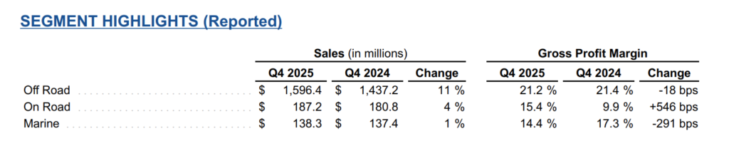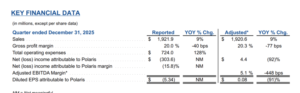 Polaris Inc. (NYSE: PII) (the “Company”) has released Q4 and full year 2025 results. For the fourth quarter, the Company reported worldwide sales of $1,922 million, up 9% compared to Q4 of 2024. North America sales of $1,623 million represented 84% of total company sales and increased 10% from $1,481 million in 2024. Operating expenses were $724 million in the fourth quarter of 2025 compared to $318 million in the fourth quarter of 2024 primarily due to charges associated with the Indian Motorcycle business held for sale, the majority of which were non-cash charges. Operating expenses as a percentage of sales were 37.7%.