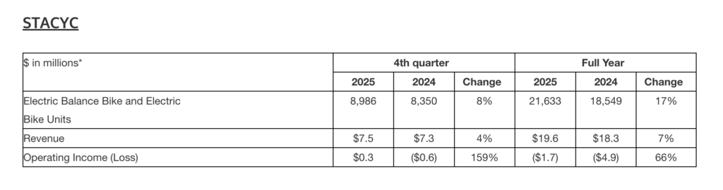 STACYC revenue increased in the full year 2025 compared to 2024 by $1.3 million primarily driven by higher volumes. Operating loss decreased by $3.2 million resulting from higher gross margin primarily due to lower fulfillment costs and reduced selling, administrative, and engineering expense compared to 2024 primarily due to lower marketing spend.