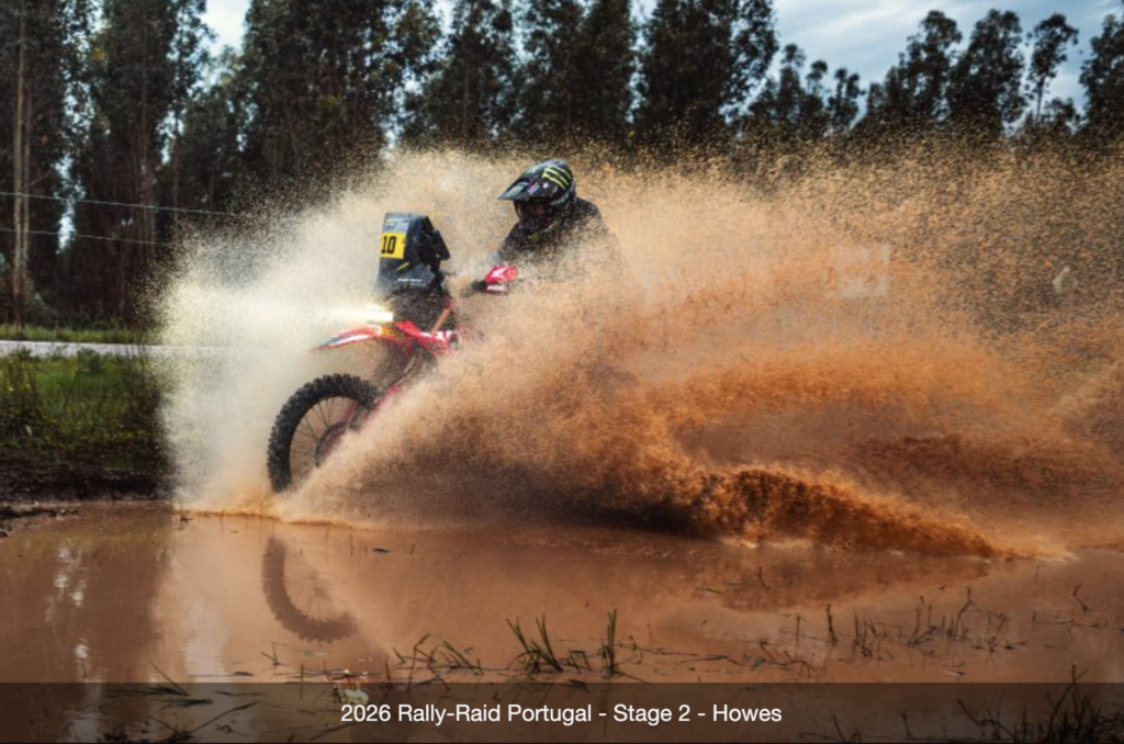 Following Stage 1’s waterlogged conditions, Stage 2 of Rally-Raid Portugal took the riders across the border into Spain. With more than 500 km on the route chart, riders were hoping for drier weather as they left the very wet Grândola bivouac at 5 a.m. The day began with a 121 km liaison before the timed 377 km special started from Salvaterra de Magos… However dryer didn’t necessarily mean easier! Top American Ricky Brabec went down again — he said yesterday he hates dropping the bike — but he bounced back from yesterday’s two-minute penalty, staying close to the leaders in the early sections. A minor off in the slippery conditions slowed him down, and he finished sixth, 3’51” back. Brabec now sits 4th overall and fellow American Skyler Howes is holding down 8th.